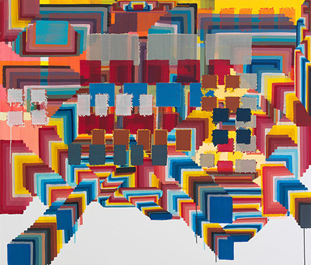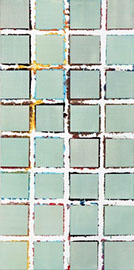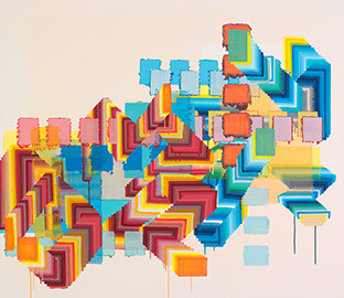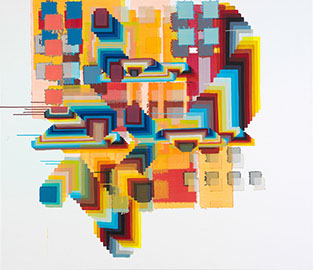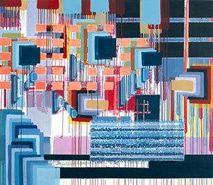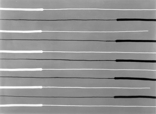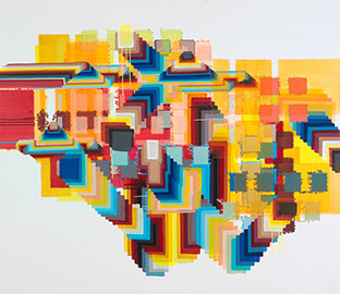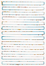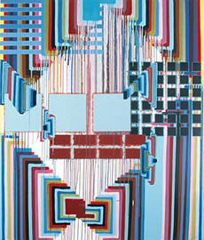 sie mit sehr nassem Pinsel über die Ränder des Klebebandes malt, wird die Farbe unaufhaltsam unter die poröse Abdeckung gezogen und saugt sich in irrationaler Ornamentik in die Leinwand ein. Der anfängliche Unfall wird inzwischen gezielt zum Einsatz gebracht und bleibt dennoch vom Zufall