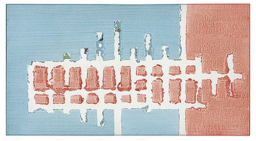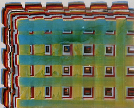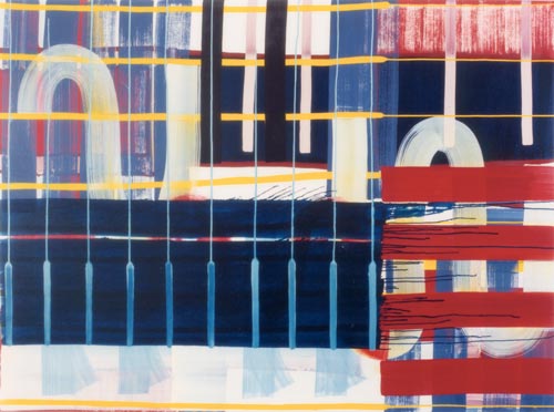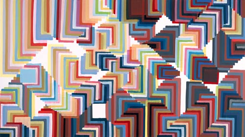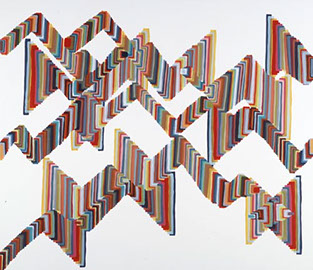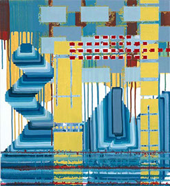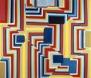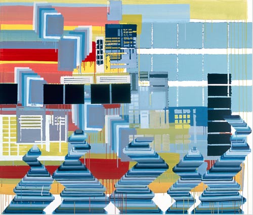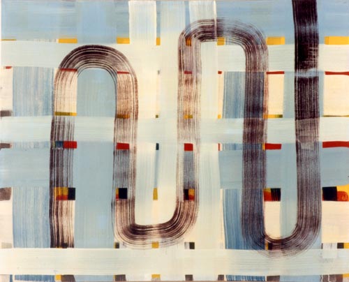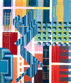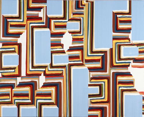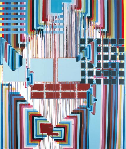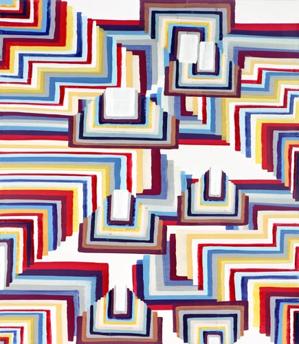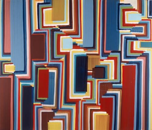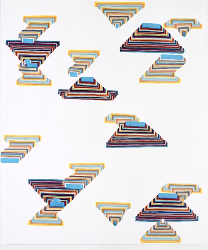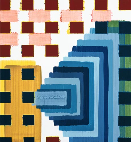 Der dritte Werkkomplex sind die Formenbilder, in denen die elementare Einfachheit des Pinselstrichs zur Raumillusion wird. Die Bildfläche teilt sich in rechteckige und quadratische Felder, die ineinandergestaffelt werden, sich überlagern oder sich welchselseitig durchdringen. Es entsteht ein System aus geometrischen Formationen, das sich selbst unendlich weiter hervorbringen kann und wie Bausteine in einem kartographischen System wirkt. Dabei wird der Bildraum als Überlagerung verschiedener Strukturen definiert, Schicht schiebt sich über Schicht, die in die Tiefe des Bildes vordringen oder aus dem Bild hinaus streben – suggestive Visualisierung einer Raumtextur, die sich in den vielschichtigen Ebenen des Bildes wie in einem Labyrinth auflöst.