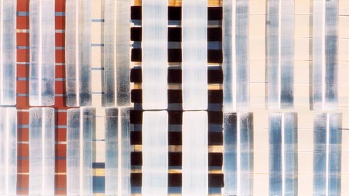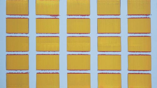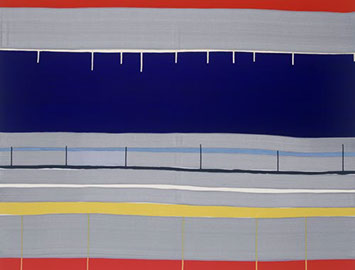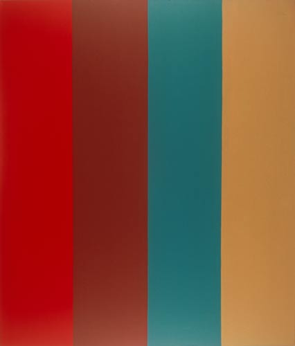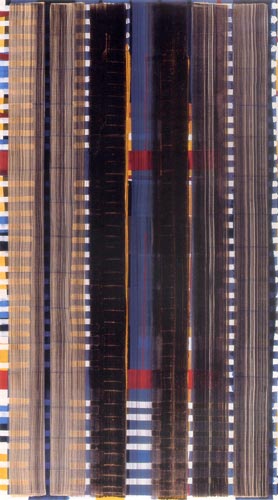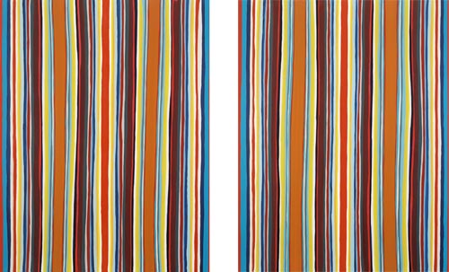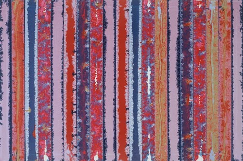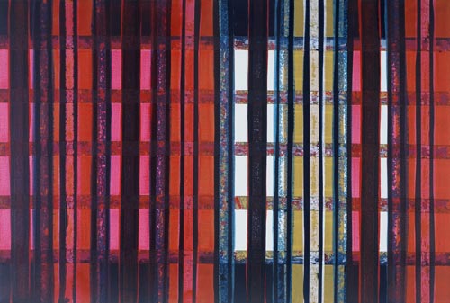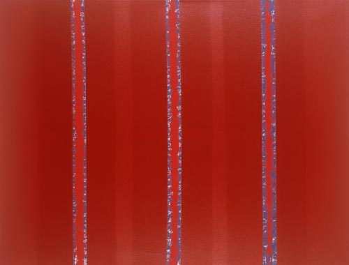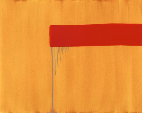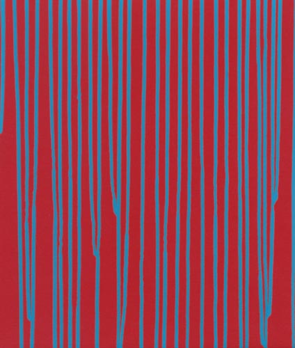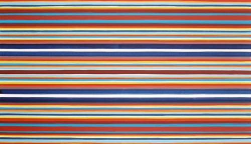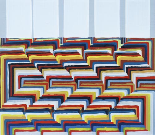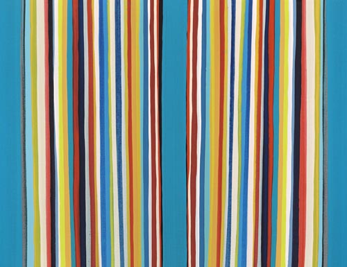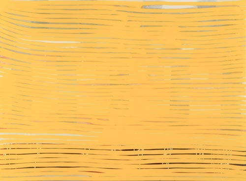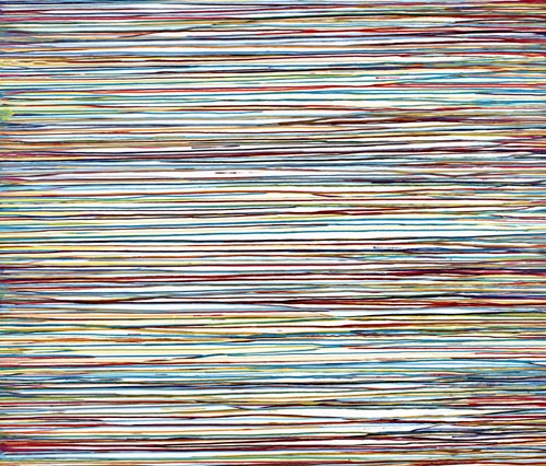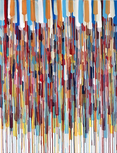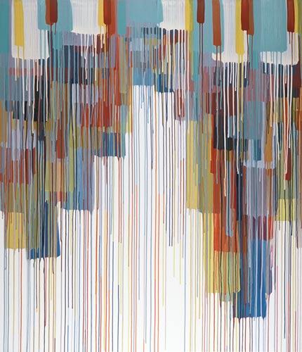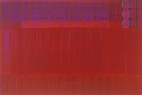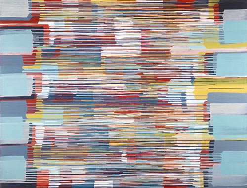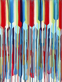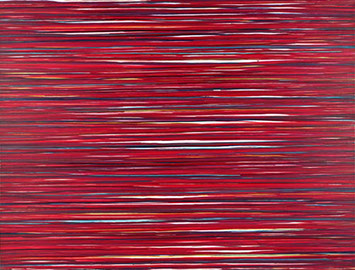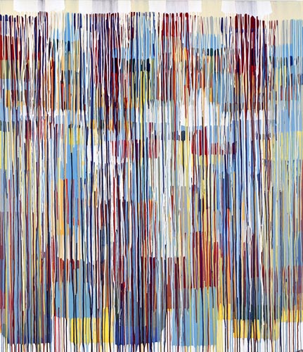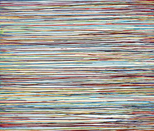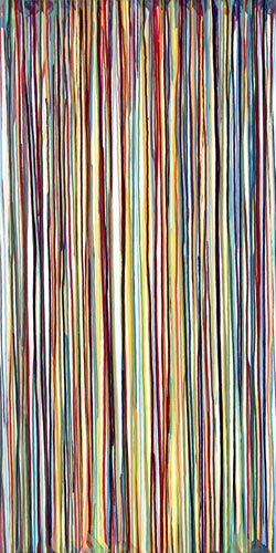 Die großformatigen „Fließbilder“ leben von ihrer dichten, stark aufgeladenen Farbigkeit. Die Streifen, jenseits strenger geometrischer Askese, gehen im Wechselspiel zwischen linearem Fließen und schwingendem Impuls auf. Die Leichtigkeit der Ausführung und die schnelle, aquarellähnliche Umsetzung verdanken sie ihrem besonderen Entstehungsprozess: Denn die Künstlerin verzichtet völlig auf ihre eigene Handschrift, auf den selbstbestimmten, dem Pinsel gedankten Duktus, sondern lässt die Farbe eigenständig vom oberen Bildrand ausfließen. Ihre Form wird folglich von ihr selbst bestimmt bzw. von der Schwerkraft und der Saugfähigkeit des Trägermaterials. Die physikalischen Gesetzmäßigkeiten werden besonders dort sichtbar, wo sich eine Farbe aus ihrem linearen Verlauf ablenken lässt und die Bahn zu einer anderen Farbe hin wechselt. Ist das Bild fertig, wird es in die Horizontale gedreht – die orthogonalen Farbverläufe scheinen so auf dem Bildgrund zu schweben, gleichsam kraftvoll durchs Bild zu pulsieren. Sie strömen und oszillieren wie sanftes Licht, das sich auf einer herbstlichen Wasseroberfläche bricht. Kontinuierliche Bewegung, Rhythmus und auch Ruhe bestimmen ihre vorherrschende Atmosphäre, deren Stärke in ihrer unerhörten Präsenz und Dichte liegt. Dazwischen jedoch taucht der Blick immer wieder in die Leerstellen der Zwischenräume ab - sinnlicher Reiz zwischen Auslassung und Dichte, zwischen Stille und Bewegung.