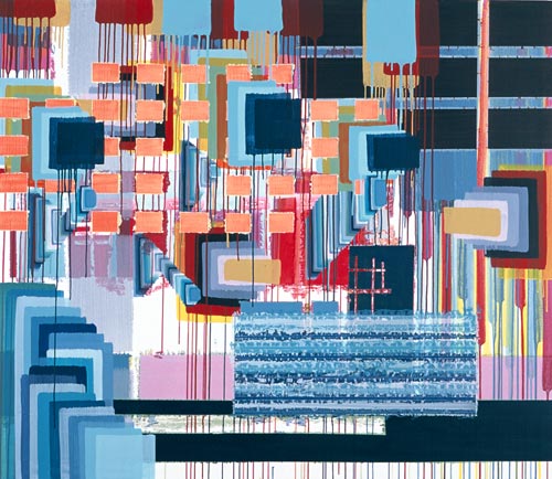 MARITA DAMKRÖGER gehört einer Generation von Malern an, die in ausreichender zeitlicher – und wenn man es noch so nennen will, postmoderner – Distanz zu den Grabenkämpfen der Avantgarde stehen, um mit einer gewissen Gelassenheit auf das umfangreiche Angebot zurückblicken können, das in jahrzehntelanger Pionierarbeit der Nachwelt ausgebreitet worden ist. Verschiedene malerische Ansätze und Verfahren kommen in Marita Damkrögers Bildern parallel zum Einsatz, etwa Drippings, All Over, Hard Edge, Color Field Painting oder grundlegende Aspekte der minimalistischen und konzeptuellen Malerei. Trotz eines erkennbaren Strebens nach formaler Kohärenz und kompositorischer Ausgewogenheit werden Widersprüche, wie sie in der Betonung von Flächenhaftigkeit oder Raumtiefe, großflächiger Gesamtwirkung und sich herauslösendem Detail zwangsläufig entstehen, ebenso wenig unterdrückt oder kaschiert wie das Aufeinanderprallen streng konstruktiver Planung und kalkulierter Zufallseffekte, etwa beim Herablaufen flüssiger Farbe.