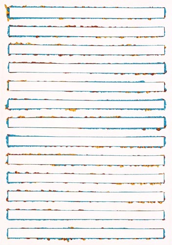 Jedes ihrer Bilder weist eine formale Geschlossenheit auf deutet aber gleichzeitig auf die Kontingenz verschiedenster anderer Möglichkeiten, innerhalb derer es steht. Linearität, Serialität und Wiederholung, wie sie in der ersten Hälfte des 20. Jahrhunderts als leitende Kriterien der ungegenständlichen Malerei auch vor einem technisch-industriellen Hintergrund entwickelt wurden, der von diesen Prinzipien bestimmt war, sind folglich keine Kategorien, die man heute auf ein Vorgehen wie das von Marita Damkröger sinnvoll anwenden könnte.